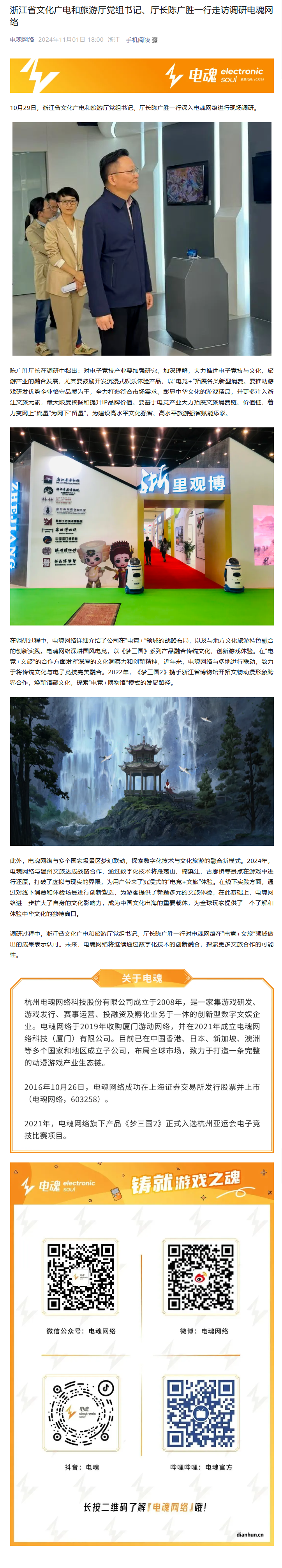 浙江省文化廣電和旅游廳黨組書記、廳長陳廣勝一行走訪調研電魂網絡
